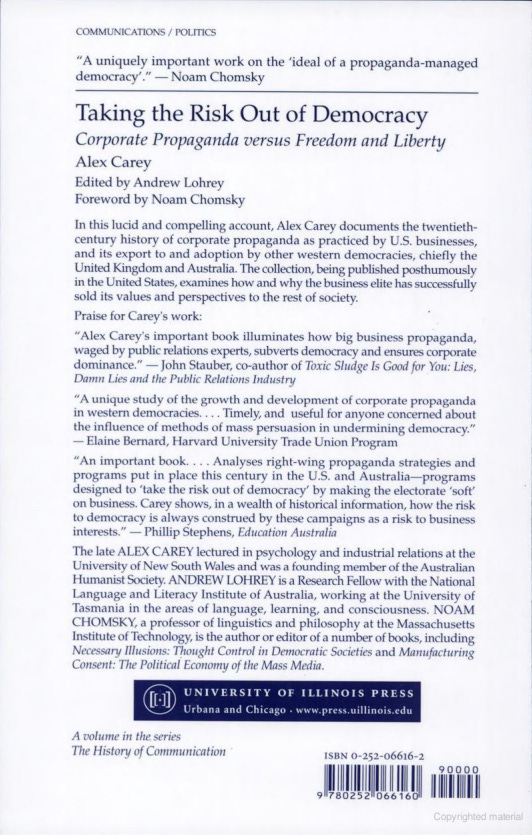 Corporate propaganda is a neglected and crucial aspect of American history that you can read about in Elizabeth Fones-Wolf’s 1992 book Selling Free Enterprise—which I quoted from above—and in Alex Carey’s 1997 book Taking the Risk Out of Democracy: